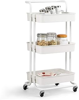 alvorog Chariot de Service Desserte, Chariot de Cuisine avec Panier de Rangement à 3 Tablettes, Chariot de Rangement à roulettes, Convient pour Salle de Bain, Cuisine, Bureau, Bibliothèque (Blanc)